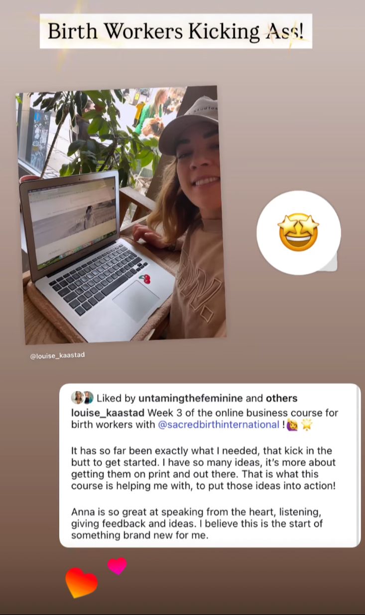 Loving this course. 💕💕💕 New to business, I have undertaken a couple of courses recently but this is by far the best, helping me to get things done, being held accountable with an amazing group of fellow birth workers. Thank you Anna, for your beautiful energy and wish to serve in such an authentic way. 💕